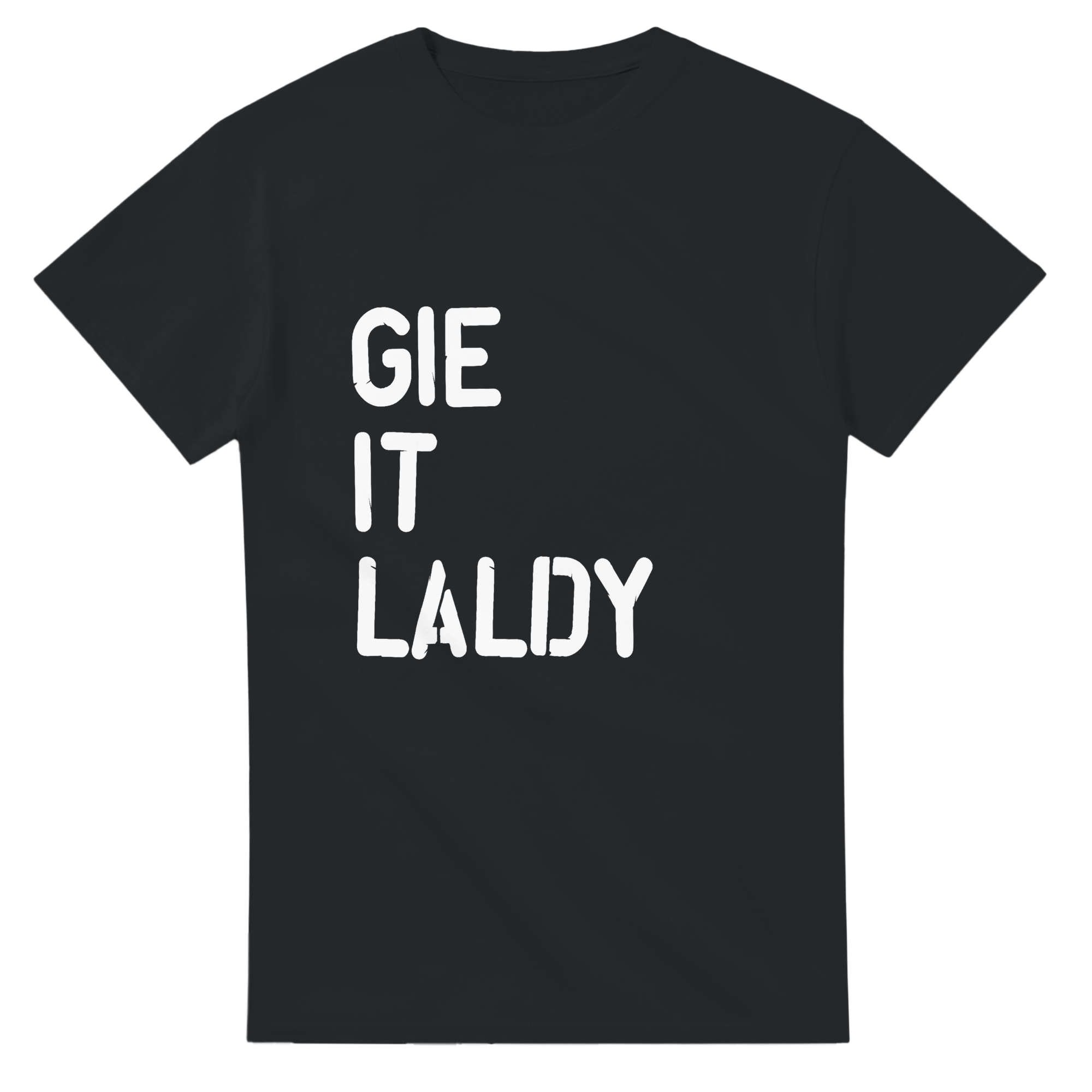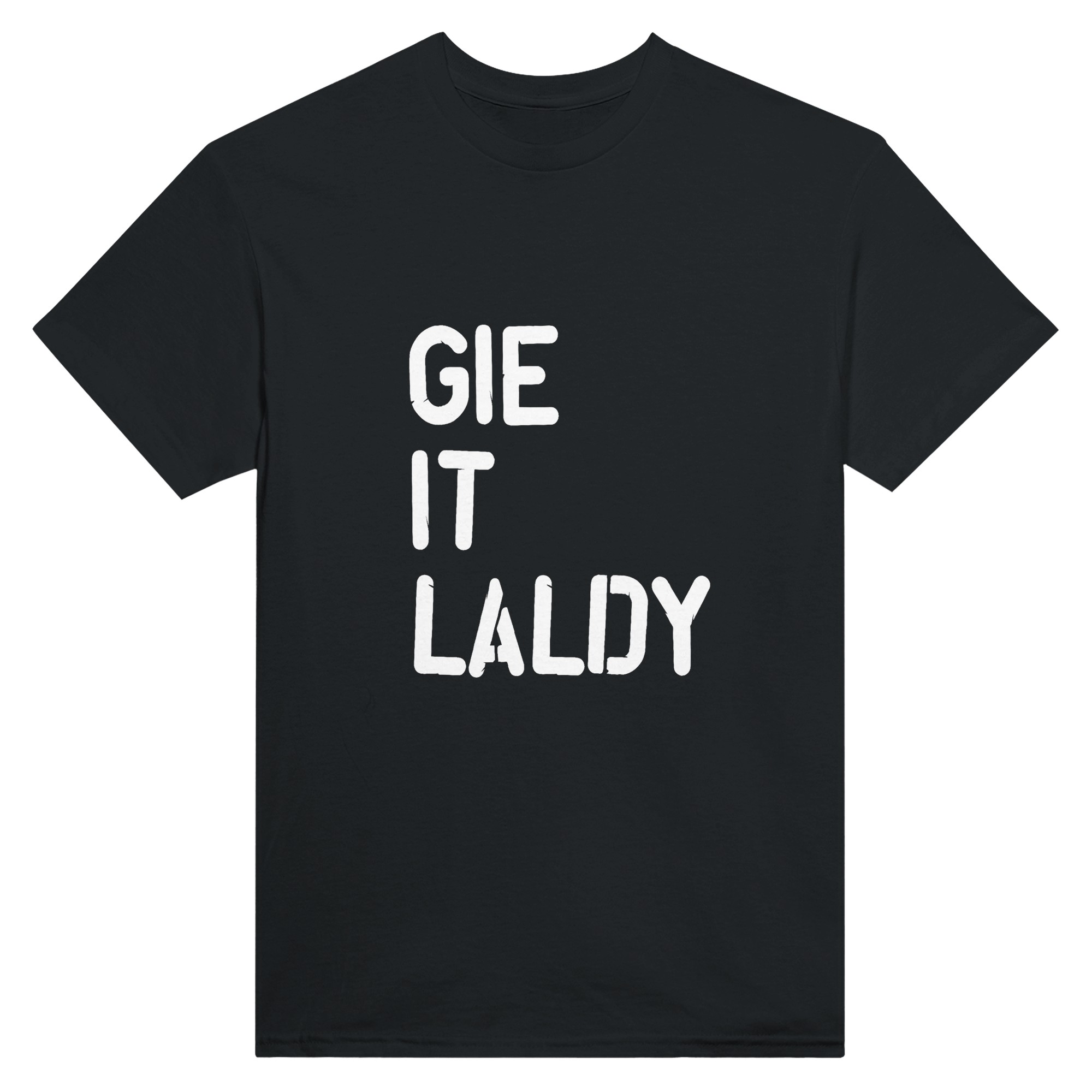 Bring some Scottish energy to your wardrobe with this “Gie It Laldy” T-shirt. Styled in a rough stencil font and printed white on dark cotton tees, this design shouts confidence and character.
